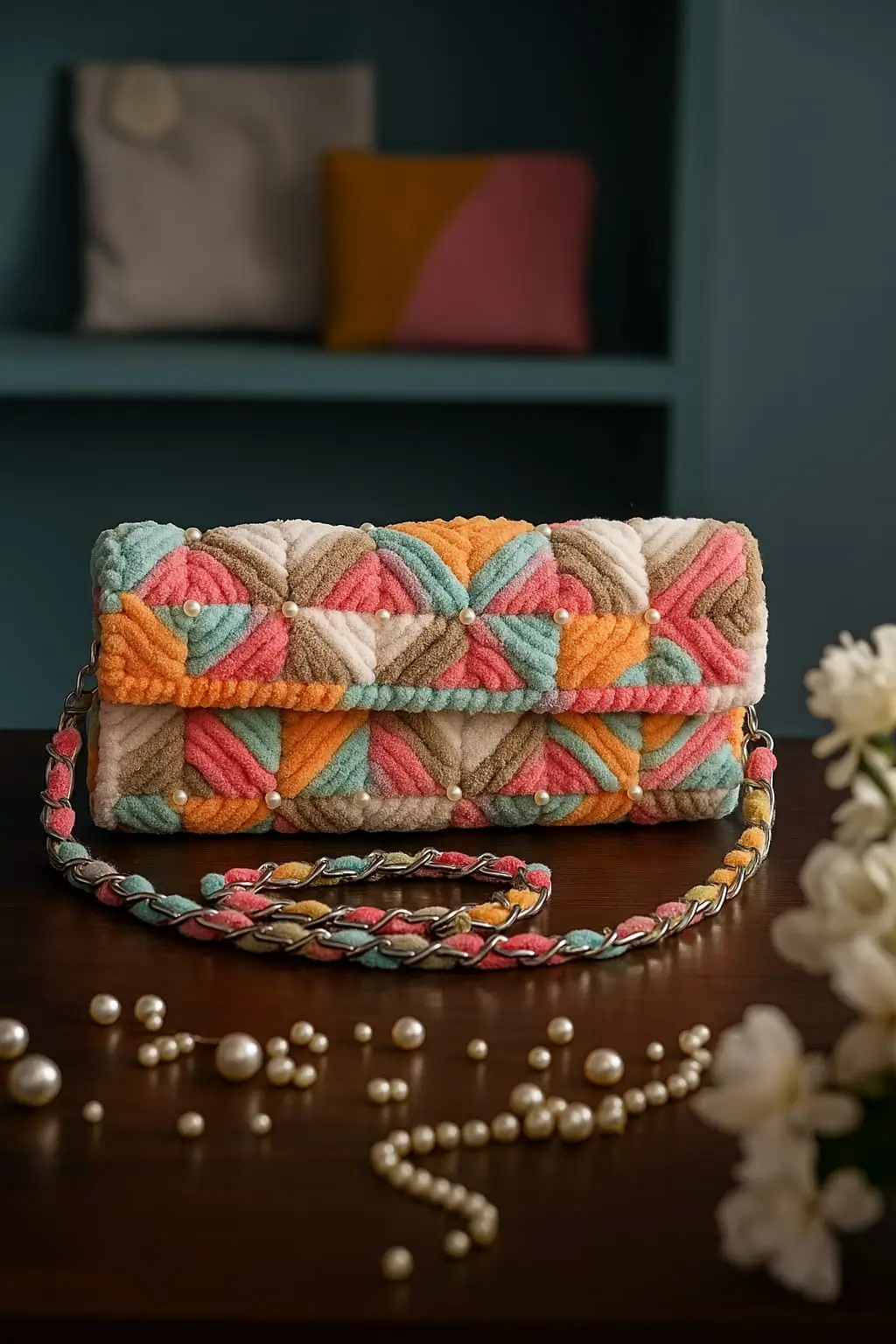 The standout feature of this bag is its textured patchwork design, created using soft yarn patterns arranged in a geometric layout. The harmonious blend of pastel shades including pink, mint green, warm orange, and soft beige gives the clutch a lively yet elegant appearance. These carefully arranged colors create a visually balanced design that instantly catches attention.